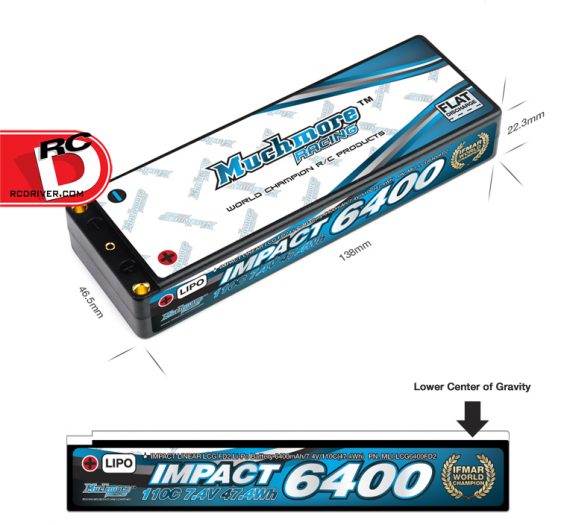 Ideal for stock and modified class on road racing, the IMPACT Linear LCG FD2 6400mAh/110C LiPo battery from Muchmore Racing has a weight of just 271g and a lower profile being just 22.3mm tall so it helps reduce and lower the center of gravity resulting in a better handling vehicle.