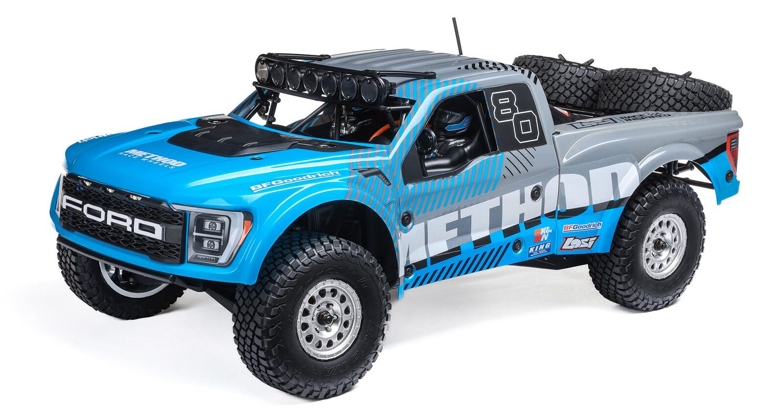 Are you looking for an off-road race truck that encompasses both jaw-dropping performance and awesome realism? Then the Losi Baja Rey 2.0 Ford desert trucks should be at the top of your list. These trucks are available with two different bodies with two different racing liveries that are officially licensed. Your choices are the Baja Rey 2.0 Ford F100 Isenhouer Brothers Heat Wave desert race truck and the Baja Rey 2.0 with 2023 Ford F-150 Raptor R body complete with a great looking Method livery paint scheme. Losi provides a feature-packed Spektrum Smart DX3 radio system to control these off-road beasts and used a powerful brushless motor system that can handle either 2S or 3S LiPo batteries. Drop in the included AA batteries into the transmitter, pick-up a 2S or 3S LiPo battery with battery charger and that is all you need to get either one of these the Losi ready-to-run Baja Rey 2.0 desert trucks rolling.