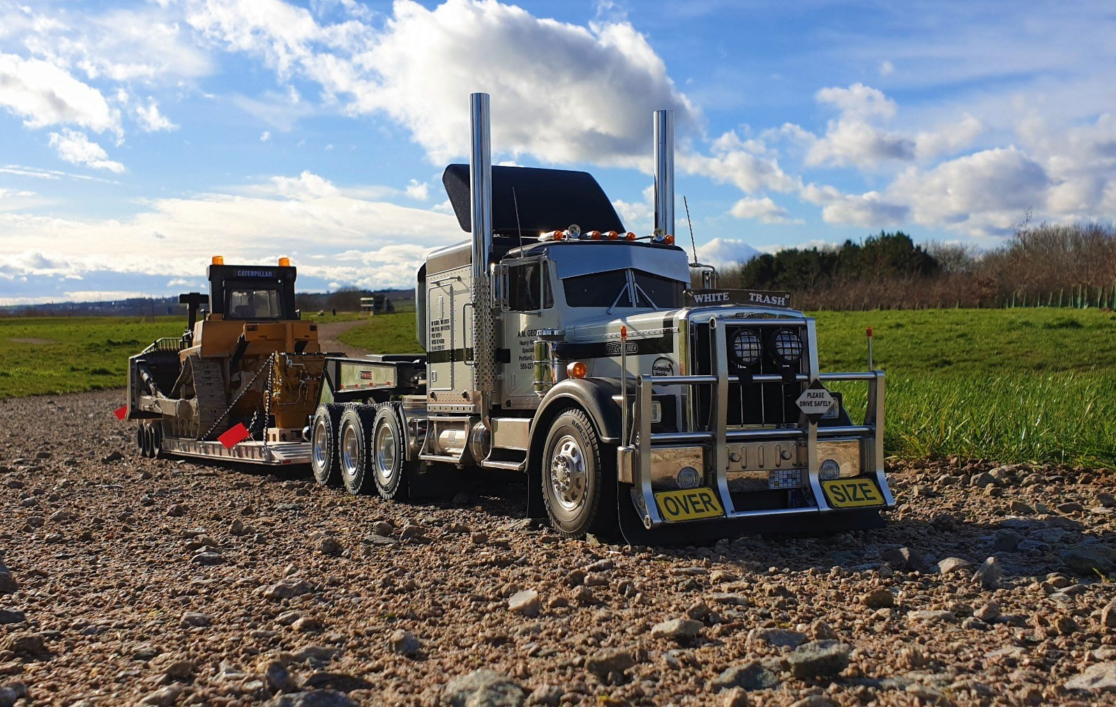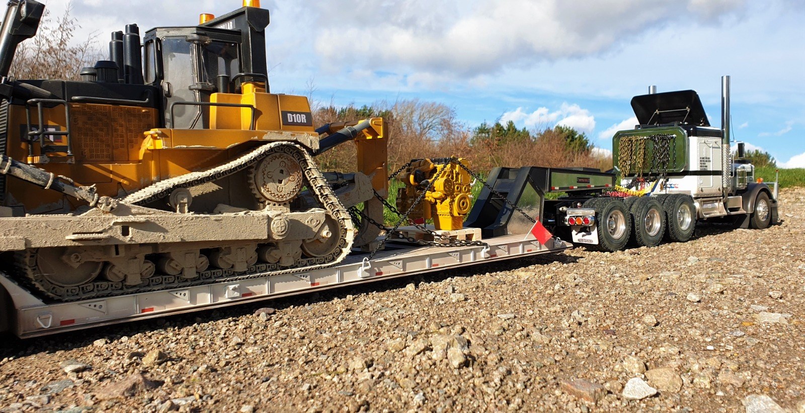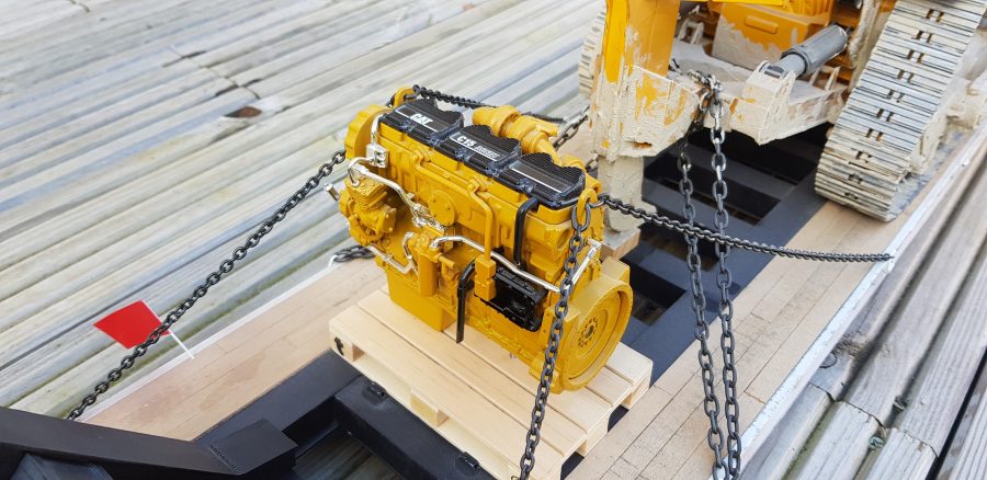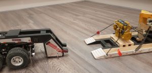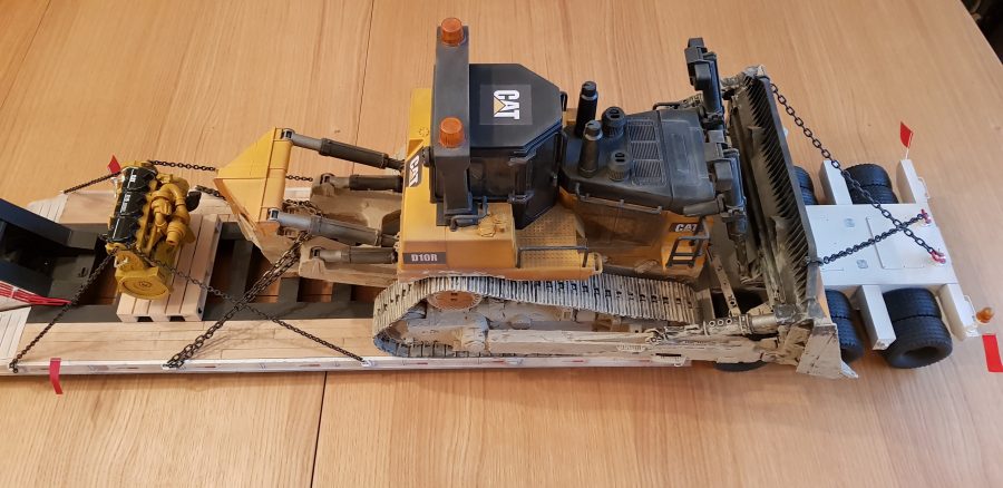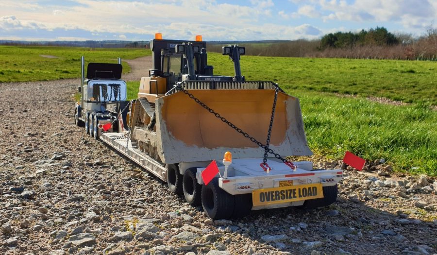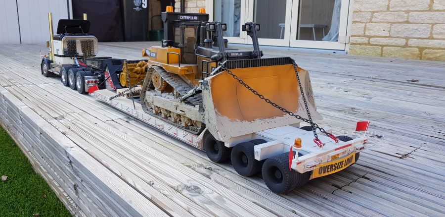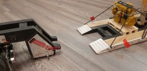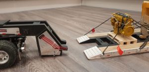 Now the trailer sits level and runs smoothly with all of the wheels making contact with the ground. Due to the additional weight, the stock motor needed to be upgraded. Keith scrapped the stock motor and installed an LRP Truck Puller motor which can handle the heavy load. Lastly, he gave the dozer a good dusting with the airbrush and added some Vallejo thick mud paint to give it a used realistic look. Chained down and accompanied by a new CAT engine on a pallet, Keith had achieved the look he was after.