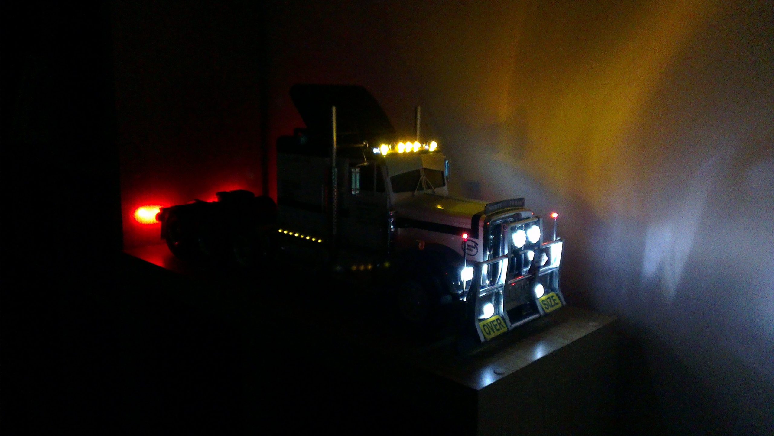 Now with the new driveline setup, Keith added some detail to boost the realism to the truck. On went a set of aluminum wheels and tires, aluminum headache rack, marker lights, chassis rail covers, mirror antennas, bug shield, spot lights, led running lights for the sleeper, oversize load signs, trailer air lines and big chrome exhaust stacks.