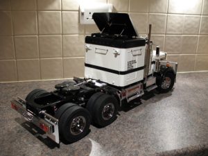 The decision to paint Hauler white was partially made for him. He went with the Glacier White color simply because he had a couple of cans on hand thus helping to keep costs down. The black trim was added to break up all the white and he called it finished. It stayed this way for a couple of years while he built different trailers for it. The current tractor trailer setup came to be when Keith decided that he wanted a lowboy trailer so it could tow one of his RC tanks around.