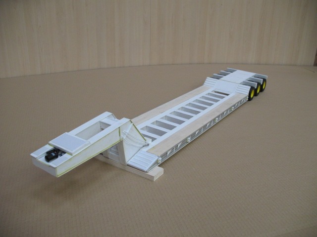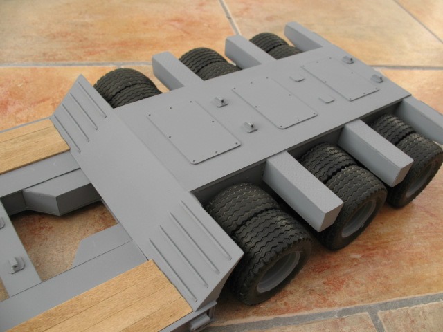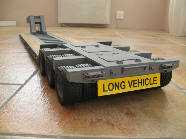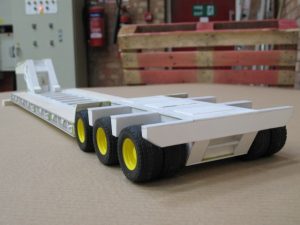 One of the standouts of this build is the lowboy trailer that Keith made from scrap plywood that is then covered with sheets of plasticard along with some aluminum channel down the sides. It has no suspension and runs on wheels and tires harvested off of a Bruder Tri-Axle Low Loader trailer. The gooseneck is manually detachable and the desired look was spot on for what he wanted.