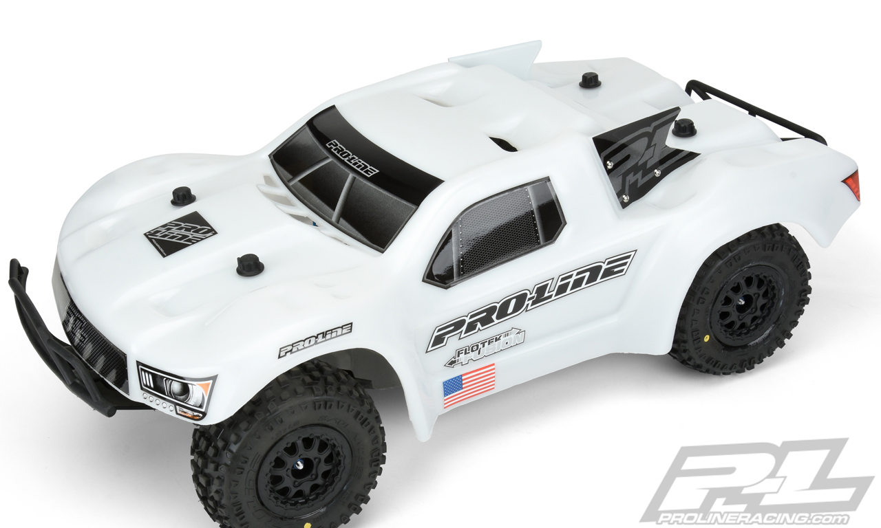 The Pre-Cut Flo-Tek Fusion Bash Armor Body stands out from all the other bodies in this top 5 Pro-Line body picks for the EXC Torment truck. It is the only body that is constructed out of Pro-Line’s Bash Armor material where the other four bodies are molded from clear polycarbonate. The Bash Armor material was developed to provide high strength and therefore give extreme durability. Along with this body’s high strength characteristic, it was designed to be as aerodynamic as possible for racing. The Bash Armor material is twice as thick as your ordinary SC body and is super flexible so that it can’t easily crack or shatter. Differing from clear polycarbonate bodies, This Flo-Teck Fusion Bash Armor body comes in white and cannot be painted. Pro-Line gives you are nice detail sticker sheet to give it its compete SC look.