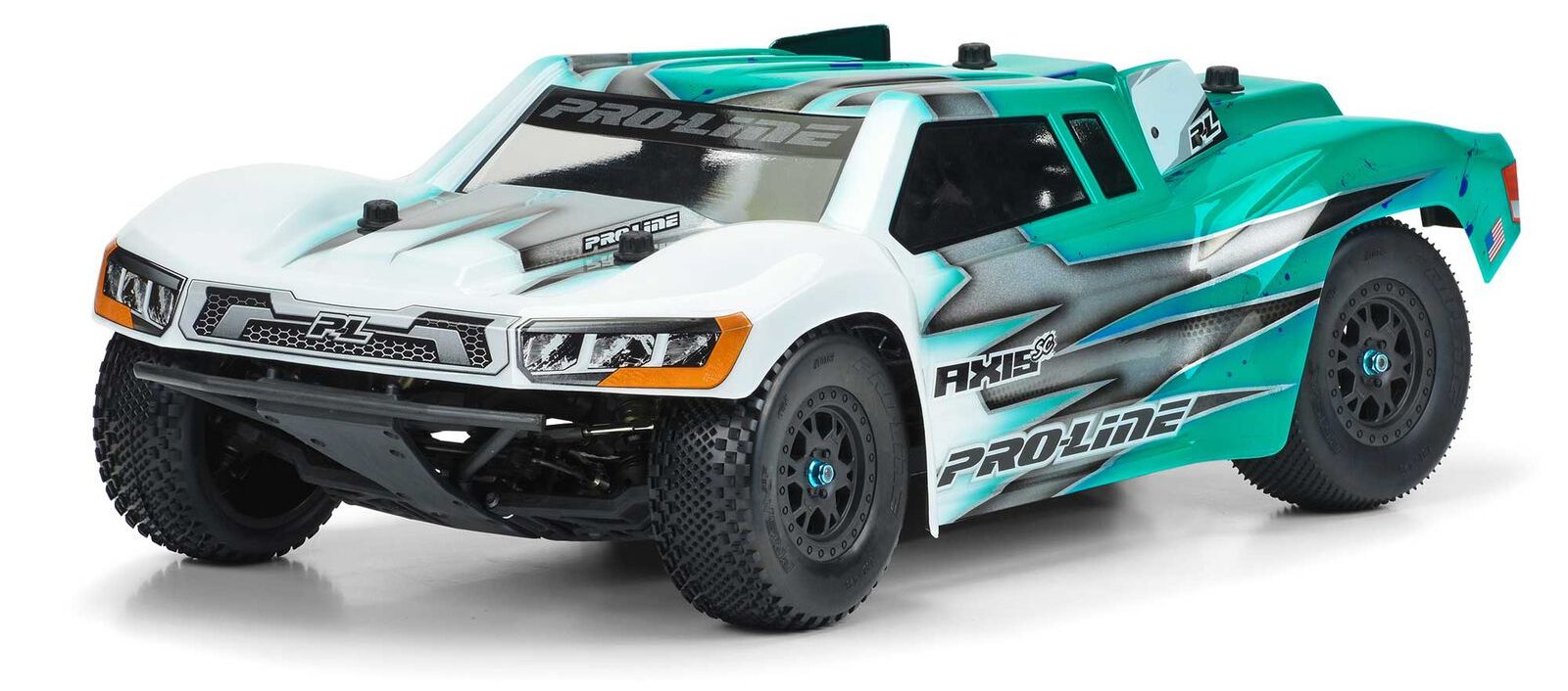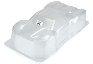 When we run short course, we like to have our truck setup for performance on the race track and the Pro-Line Axis body is purpose made for racing. Pro-Line gave the Axis a clean-sheet design that is not only functional but has a fresh look for the SC racing class. It has a low center of gravity which allows you to drive more aggressively and be faster through both low-speed and high speed corners. This makes it ideal for high-bite carpet or indoor clay tracks. At the rear you will find large cutouts so that air can escape from under the body and it reduces the overall weight. The body comes clear and includes window masks, a detail sticker sheet and overspray film.