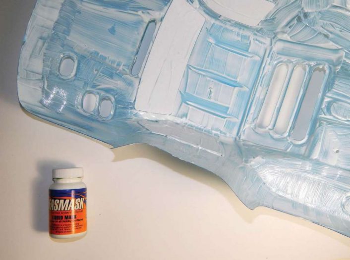 After you’ve trimmed and test-fitted the body, it is time to prep it for paint. The body must be scrubbed out with warm water and some dish soap to remove any residual oils that can mess up your paint. Then I apply the included precut window mask. There are numerous techniques you can use to mask your paint job, but liquid mask has become my go-to method. To apply the Fasmask I just pour a little bit into the roof, then use a foam brush to start spreading it. I do two or three good thick coats, allowing a couple of hours drying time between coats and preferably overnight after the last coat.
