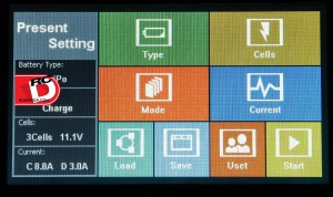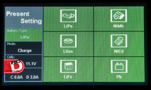 Touching Type will open a new screen where the six battery options, LiPo, NiMh, LiIon, NiCd, LiFe and Pb can be chosen from. Once you choose your desired battery type the charger returns to the main screen.