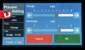 Touching Mode will open a screen that allows the user to pick the charging mode. While the options here vary depending on the battery type, some options include charge, fast charge, balance charge, fast charge, discharge and more.