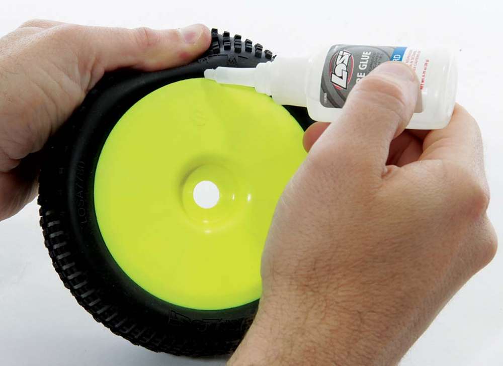 One of the most amaz- ing feats I have ever seen was when I saw Adam Drake run almost 45 minutes of an hour long main event with one of his front tires partially unglued and the insert flopping all around. When asked about it later he admitted that he had forgotten to check his tires before the main and, due to the side forces during cornering, his tire had literally been ripped off of the wheel. Checking your tires is as easy as trying to pull the tire away from the bead and touch- ing up any areas where the tire does pull away from the wheel. Before touching up the bead you may want to use some motor spray to clean up the tire and wheel to ensure the CA has as clean a surface to bond to as possible.