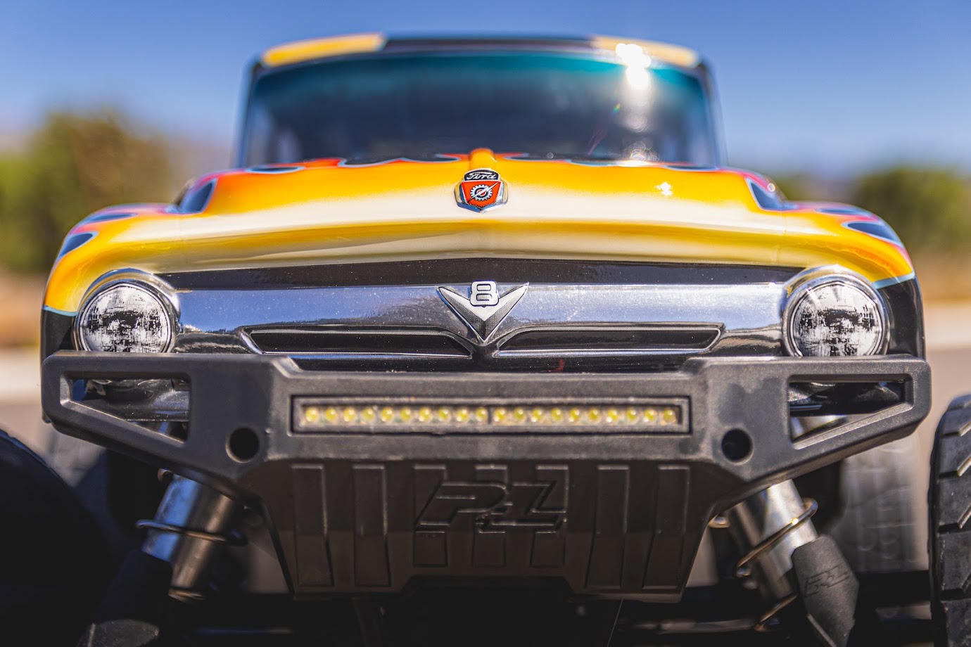 Pro-Line is excited to bring some retro classic styling to the X-MAXX for the first time. This old-school Ford F-100 body completely transforms the look of your truck, featuring a custom hot-rod style extended cab, aggressive fender flares, and the iconic old-school chrome grill of the ’56 blue oval fan favorite. Pair the F-100 with the Menace 5.7″ Belted Tires (PRO1020510) for a true street machine combo.