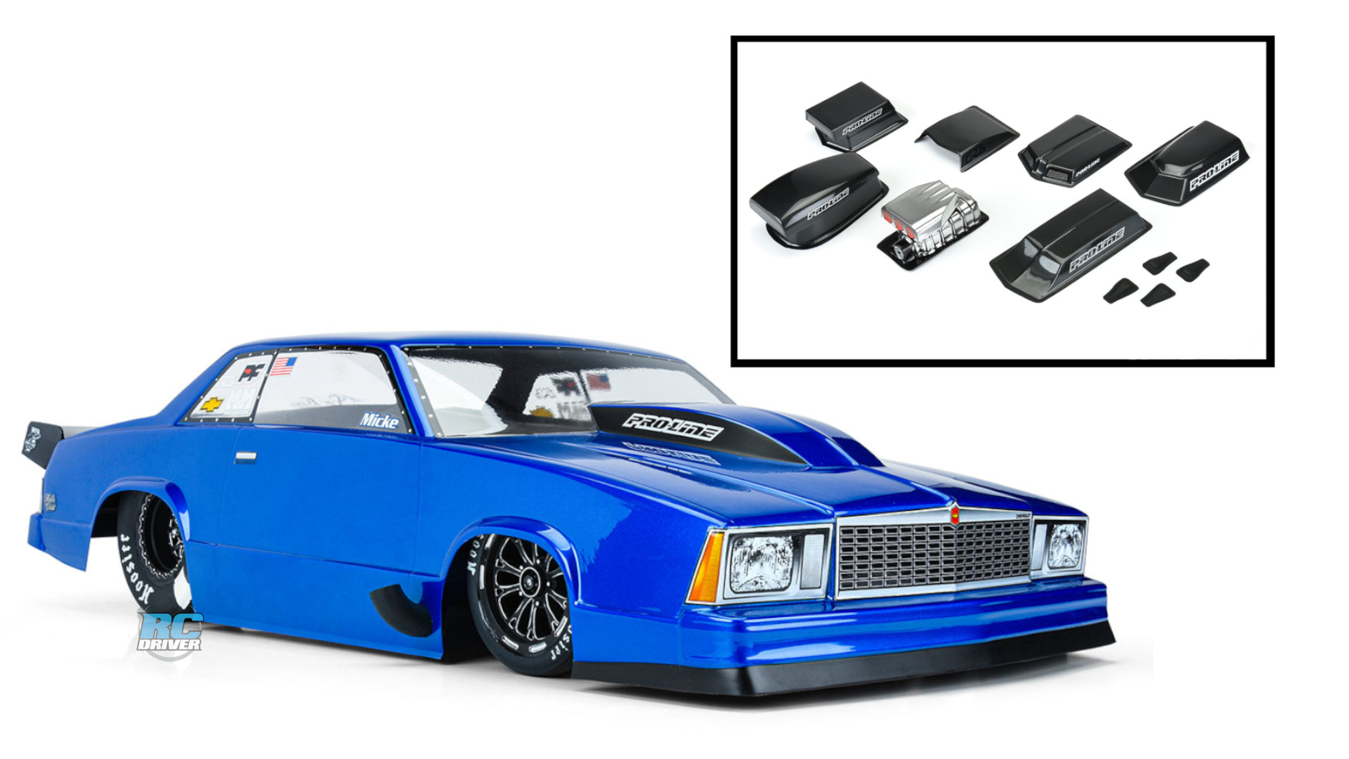 One sick looking new body and option parts…all for no-prep drag racing and from aftermarket masters…Pro-Line. Shown here is the Pro-Line 1978 Chevrolet Malibu drag body and optional hood scoops/blowers.