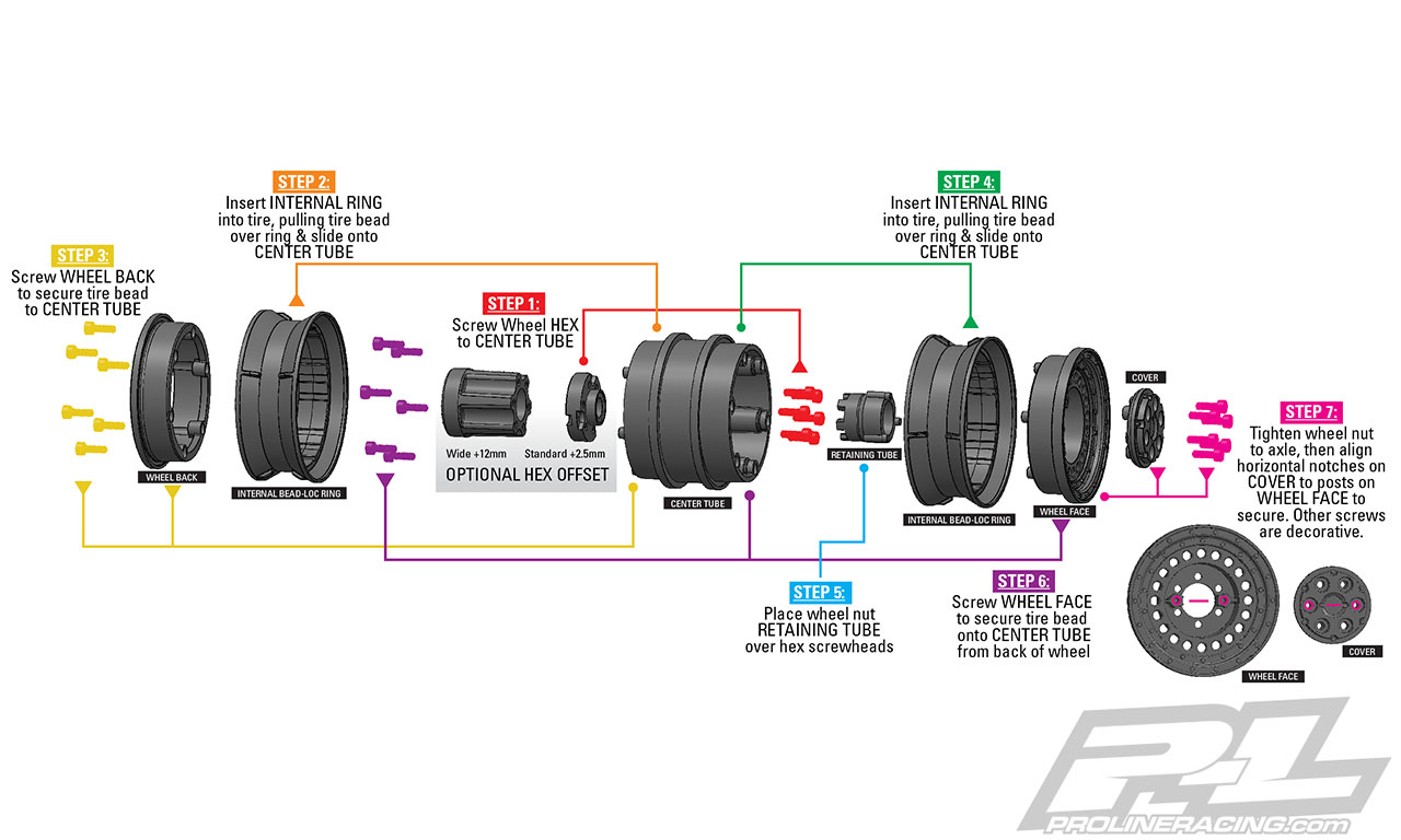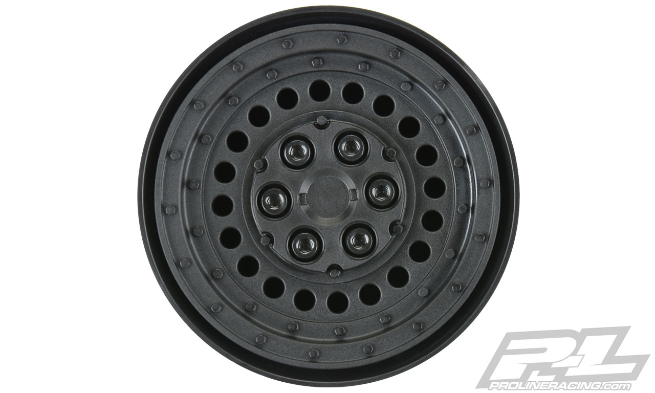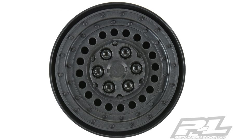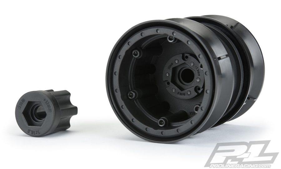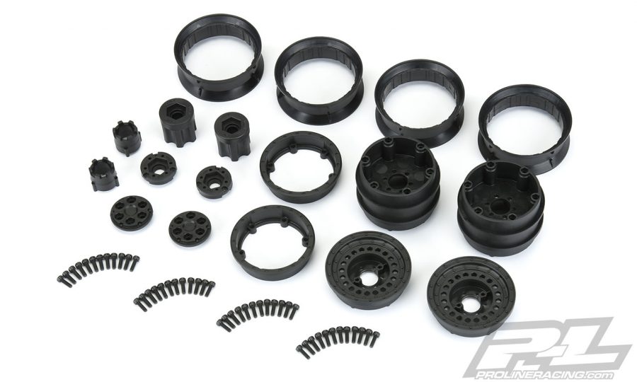Pro-Line is proud to introduce their new Carbine 1.9″ Dually Wheels. This pair of Carbine dually wheels will go perfectly with your next military-style or extreme off-road build and will fit 4 standard 1.9″ tires, 2 tires per wheel. The best part of the Carbine is the modular wheel design that allows it to be used as a single tire wheel, dual tire wheel, or you can keep adding as many tires as you want with the addition of more Carbine wheels. The face of the Carbine 1.9″ wheel features 20 small holes with molded-in bead-loc detail for a tough military look. The included scale wheel nut cover attaches with two screws and completes the rugged appearance. The Carbine Dually wheel includes two optional 12mm hex offsets to fit both straight axles and portal axles and to give you the option for a narrow or wide offset.
