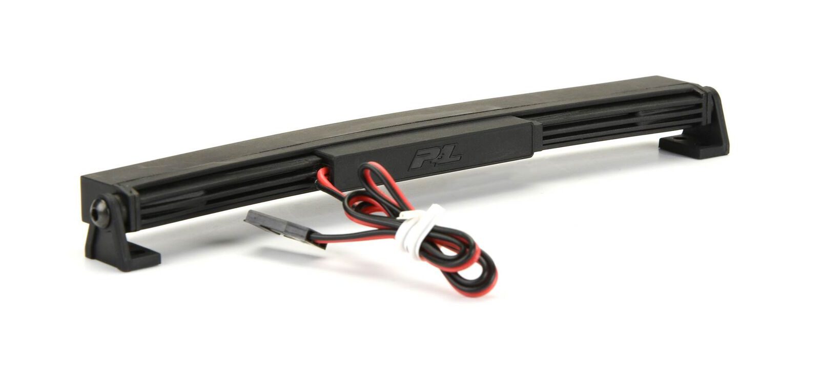 Realistic scale vehicles are incredibly popular and the Pro-Line Super-Bright LED Light Bar Kits not only add scale realism to a vehicle, but also function. Pro-Line offers five different LED Light Bar Kits including a 2-inch (#PRO627600), a 4-inch (#PRO627601), a 5-inch (#PRO627603), a 6-inch (#627602) shown here and a 1/5 Double Row 6-inch light bar kit. Each kit is equipped with real, working LED lights. The LED Light bulbs are pre-wired with a 12-inch long cable that can plug directly into your receiver for power. The Lights are rated for 6V to 12V power, so you have the option to plug directly into a 3S LiPo power source for Super-Bright LED Light. The LED Lights are housed in a durable Black Nylon housing branded with a P-L logo. Mounts and hardware are included so that you can do a custom install on your Rock Crawler, Rock Racer, 1/8 monster truck, 1/10 monster truck or even a 1/5-scale vehicle.