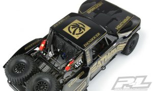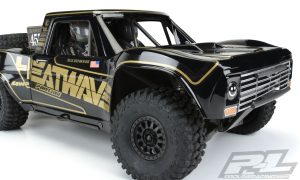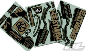 Pro-Line is calling out the the HeatWave 1967 Ford F-100 race truck body as pre-painted, however it is actually much better than paint. The body is molded from black polycarbonate, hence the “first of its kind” statement, so it is black all the way through. This means if you get a few scratches or take some good hits, this body will always stay black. Pro-Line sells the body as pre-cut including the massive Black and Gold Heatwave livery decal wrap so completing the body and installation is a cinch.