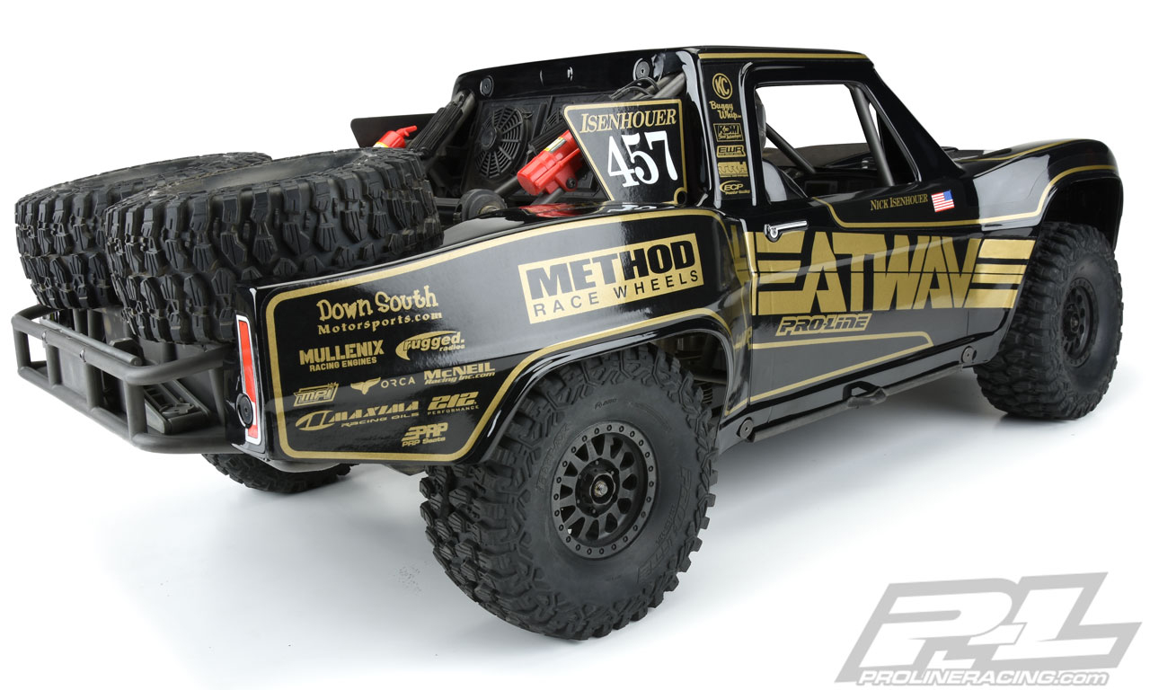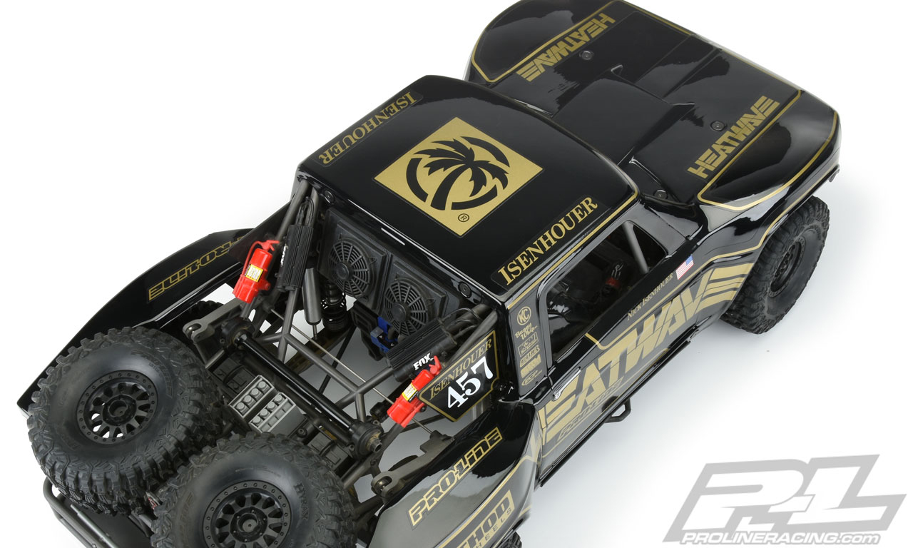 Using a Traxxas Unlimited Desert Racer along with the new Pro-Line HeatWave 1967 Ford F-100 race truck body allows you to now build a fully licensed replica of the popular full-size Heatwave Trophy Truck driven by Chris Isenhouer. Chris races his iconic Black and Gold Heatwave Ford F-100 converted to Trophy Truck specs in the unrelenting desert along with his brother Nick.