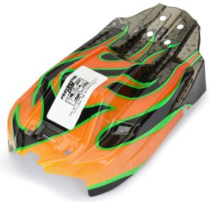 Now you can have a Pro-Line Axis body for your Typhon GROM to match your 1/10 version in a cool paint scheme. Designed with the latest in CAD technology, the Axis features a super low-slung design with sharp lines throughout giving it an unmistakable look on the track, and fits the Typhon GROM chassis perfectly. The Axis features a cab-forward design that provides enhanced steering response while the small side fins balance out the rear of the car with ideal side-bite.