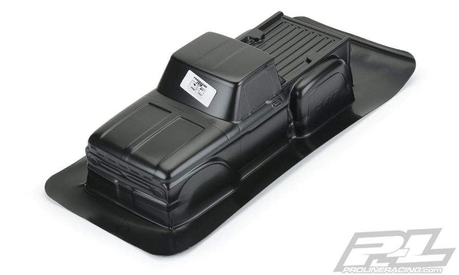 The classic looks of the 1966 Ford F-100 is nicely recreated here by Pro-Line. It is complete with the body lines, step sides, large fender flares and ornate grille that make this such a loved truck from the past. Pro-Line offers the ’66 in either crystal clear polycarbonate that needs to be painted or in its Tough-Color black polycarbonate so that you won’t ever have to worry about paint peeling off or chipping.
