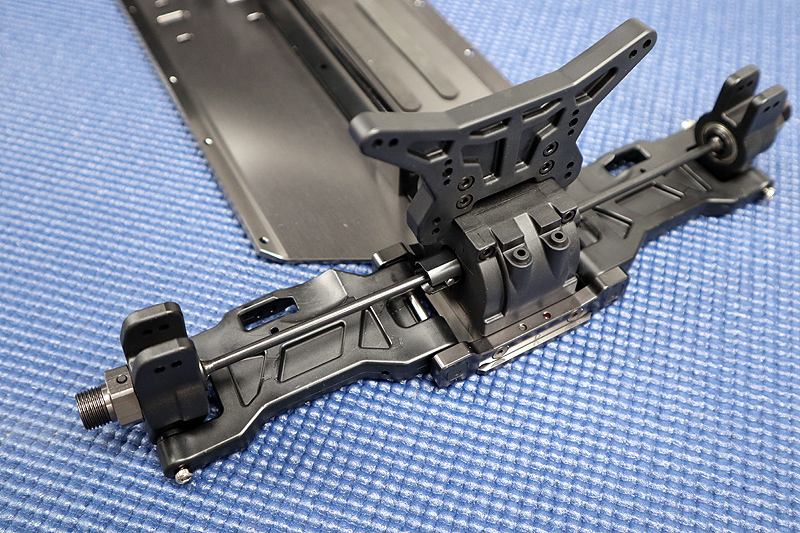 Slip the center driveshaft into the gearcase side, then feed it through the rear brace to the center diff and bolt the rear clip down. Remember to use threadlock on the screws that go into metal.
