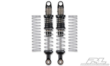 The next generation of Pro-Line Shock Technology is available; Pro-Line Pro-Spec Shocks! These shocks are Pre-Assembled, just fill with your choice of shock oil (not included). Every last detail has been refined to give you the best performing and best looking Shocks ever made. The Pro-Spec Shocks are a 12mm Big Bore design with a Single Low Friction X-Ring Seal. The Pistons and Shaft Guides are made from Silky Smooth White Delrin for Low Stiction and the 3.5mm thick Shock Shaft is Hard Chrome Coated, just like full scale racing shocks. The Pro-Spec Shocks feature an easy access Bleeder Cap Screw for consistent shock builds every time. Each pair of Pro-Spec Shocks includes 3 different piston options (1.4, 1.6 & 1.8) and a blank piston for drilling to a custom size. Custom Shock Tightening Tools and optional shock limiters are also included. Optional Pro-Spec Springs are available separately. Upper and lower shock pivot balls are included so you can fit a wider range of vehicles right out of the box.