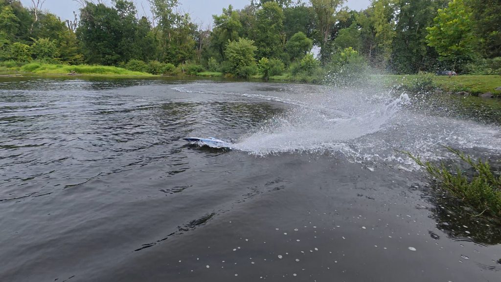 On the water, the ProBoat Sonicwake 24 feels quick, stable, and responsive. GPS testing in a small pond yielded 32–33 mph runs, with the potential to hit the full 35 mph on a larger stretch of water. The boat planes quickly, carves sharp turns, and tracks straight even at full throttle. Right turns are a bit tighter than lefts, but both are predictable with proper throttle management.