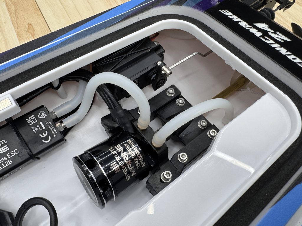 The Sonicwake 24 comes fully equipped with a 50A water-cooled ESC, Spektrum SR215 receiver, and a 2500KV brushless outrunner motor for fast acceleration and top-end speed. Steering is handled by a ProBoat 5.3kg nylon gear servo. While a metal-gear servo would improve long-term durability, the included unit is quick and responsive for most users.