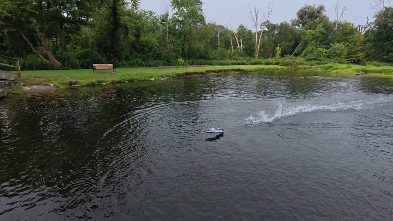 On the water, the ProBoat Sonicwake 24 feels quick, stable, and responsive. GPS testing in a small pond yielded 32–33 mph runs, with the potential to hit the full 35 mph on a larger stretch of water. The boat planes quickly, carves sharp turns, and tracks straight even at full throttle. Right turns are a bit tighter than lefts, but both are predictable with proper throttle management.