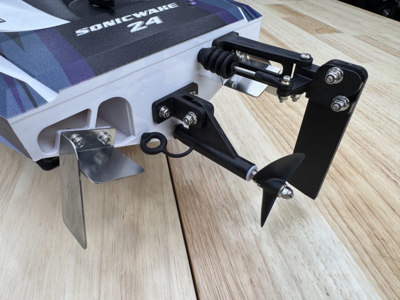 ProBoat gave the Sonicwake 24 a solid mix of metal and composite running gear for strength and efficiency. The metal trim tabs and turn fins are a single-piece design, while the rudder, rudder bracket, and strut assembly are made from durable composite materials. The rudder’s breakaway feature prevents serious damage if it hits an obstacle, a thoughtful addition for pond running.