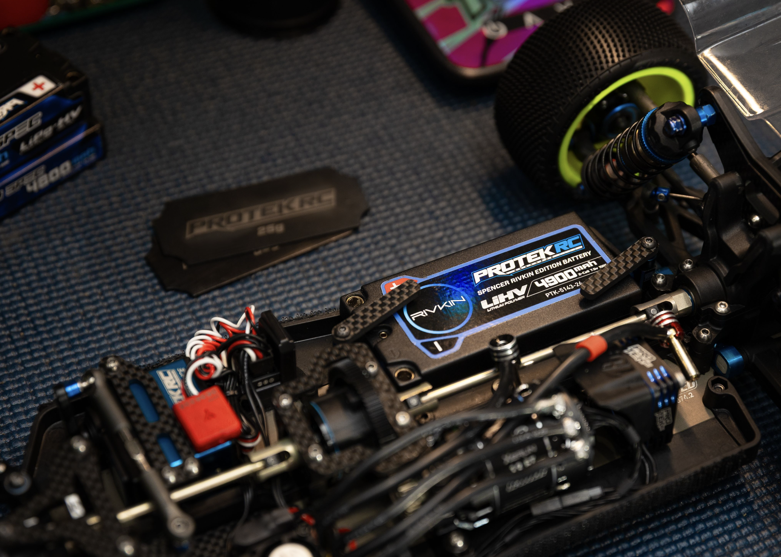 Headlining this battery announcement is the PTK-5143-26 ProTek RC Spencer Rivkin 2S 150C Low IR SG3 HV 4900mAh Ultra LCG LiPo shorty battery pack. Developed in collaboration with two-time IFMAR World Champion Spencer Rivkin, PTK-5143-26 is equipped with a built-in specialized bottom pocket for adding weight plates, allowing precise chassis balance tuning for improved rotation, stability, and control. PTK-5077 (10g, 20g, 30g) and PTK-5078 (25g, 35g, 45g) weight plates are sold separately and fit perfectly into the bottom of the Rivkin Edition battery, keeping the battery ultra-low CG rather than adding weight tape or other weight units, thus increasing the height of a standard competition battery.