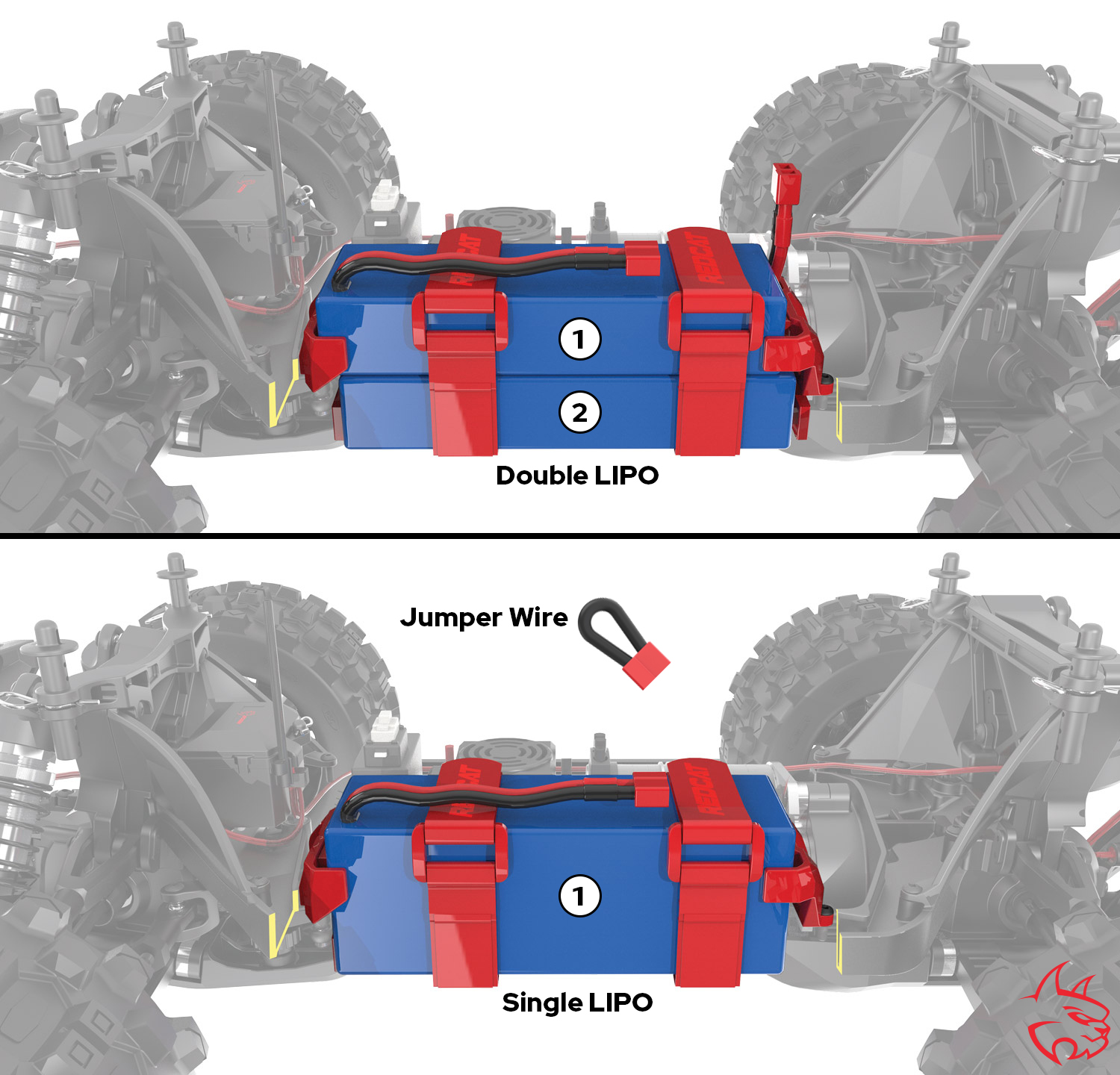 - Battery (not included): Uses (2x) 3S LIPOs, (1x) 6S LIPO, (2x) 2S LIPOs, or (1x) 4S LIPO