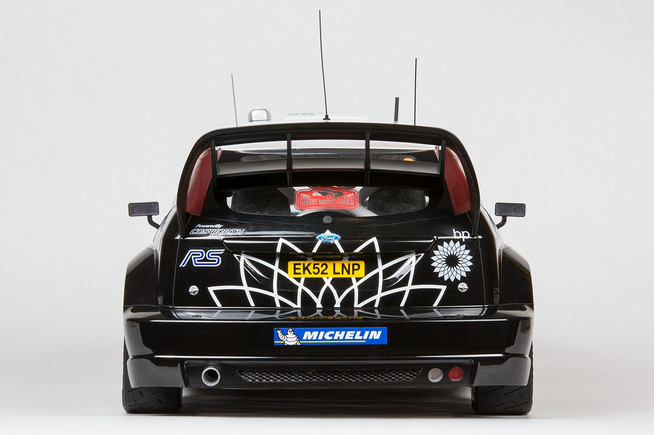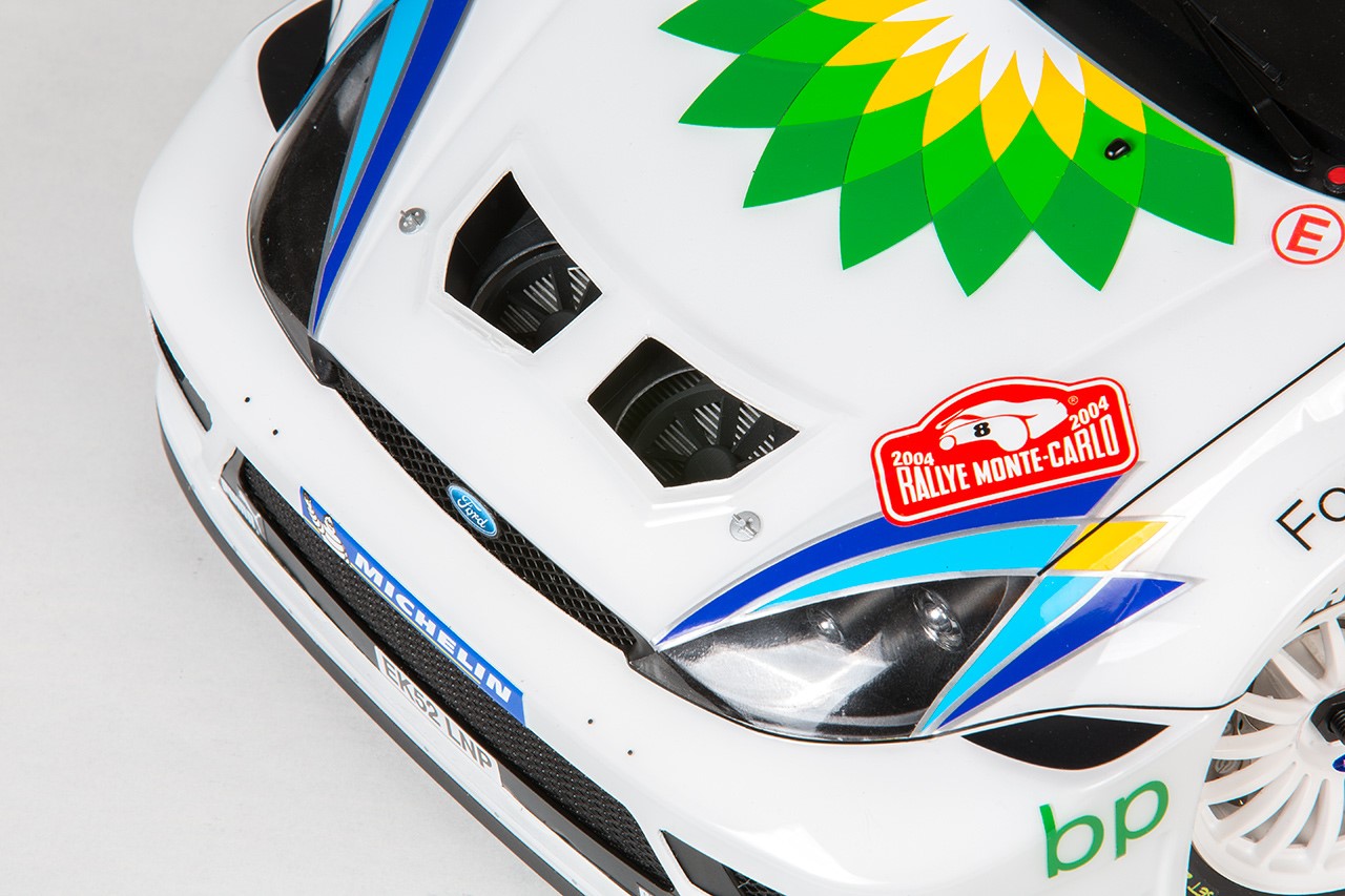 Every time Adrian builds a new car he finds some way to make it take longer than the last one, but the effort to pull this one off was a bigger step than ever before. The main reason being the custom graphics. The car is based on the Tamiya 2003 Ford Focus RS WRC body set (item #51037), but with the 2004 Monte Carlo livery. Adrian felt the stock 2003 box art scheme was a bit basic and uninspiring…all white paint with a white wing, white mirrors and predominantly blue graphics. The BP livery is much more colorful and eye catching, yet was not easy because no-one makes these stickers