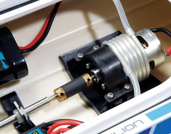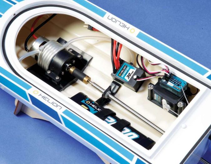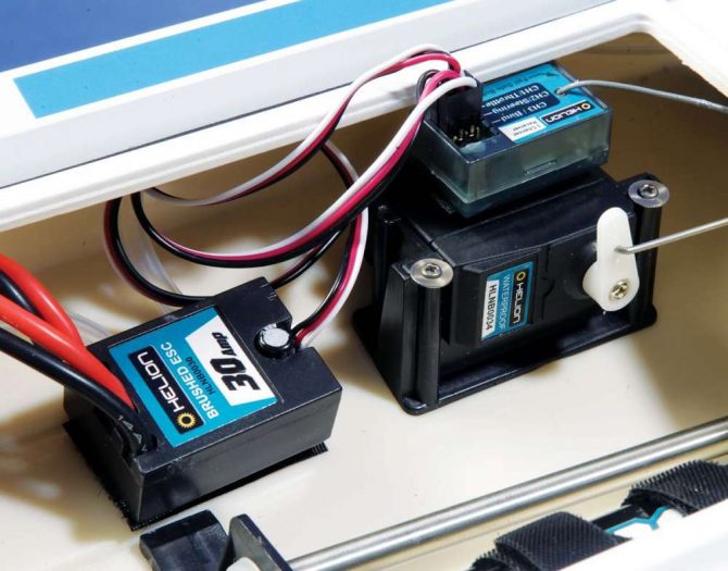 Designed with a large deck opening, the hull gives you plenty of easy access to the various internal drive/control pieces. A unique latch is used to lock the hatch in place – no hatch tape required. The motor, ESC, receiver and steering servo are installed on the right side of the hull while the 2600mAh 7.2V NiMH battery is secured to the left side of the hull via two Velcro straps. The steering servo is a standard size and provides plenty of authority for responsive steering. The steering pushrod is connected via a Z bend at the control horn on the servo and it uses an adjustable holder on the rudder. Out of the box we needed to use the Allen wrench to adjust the rudder so it was straight when in the neutral position.