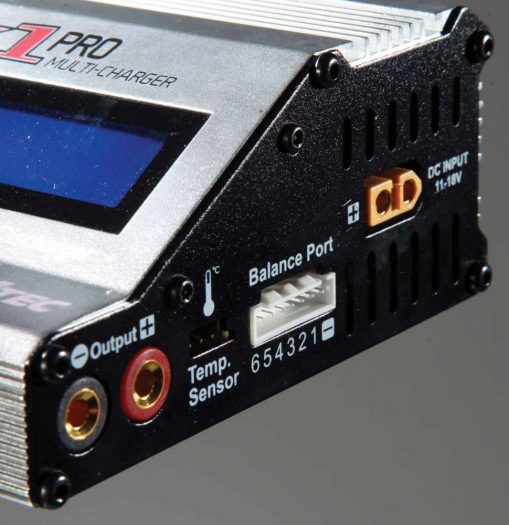 The charger looks fantastic with its silver aluminum outer casing and black anodized aluminum side plates. Logos and battery capability information are screen printed on the face of the charger and in primary view is the 2×16 LCD blue backlit screen and single toggle-style function knob. On the side of the panel are the charger output jacks, temp sensor port, balance plug input and a DC input plug. The opposite panel is bare, with the exception of the fan cutout to draw air in and over the internals. Now let’s talk charging ability. The X1 Pro will charge 1-6S LiPo, LiFe and LiIon, 1-15 cell NiMh and NiCd and also 2-20 cell PB batteries. This charger has all of your radio control charging needs covered.