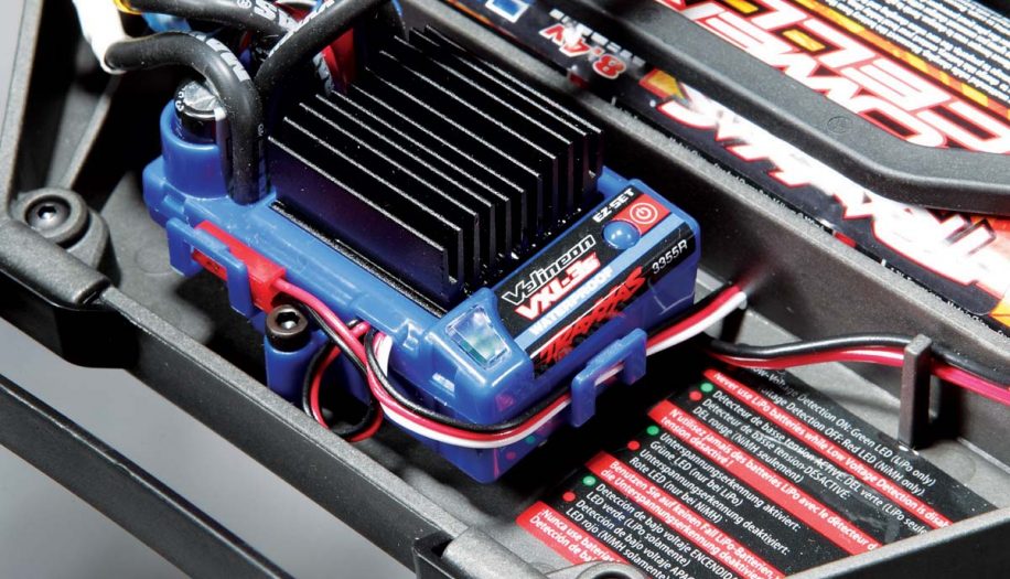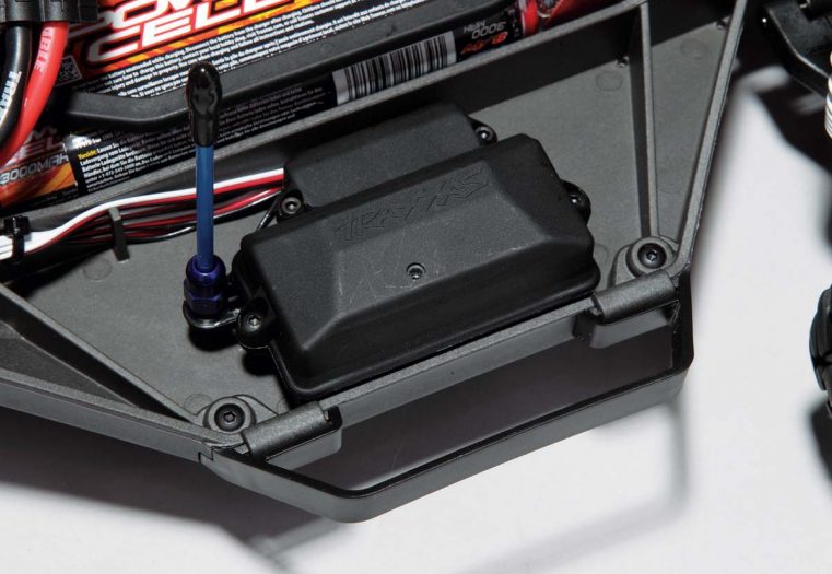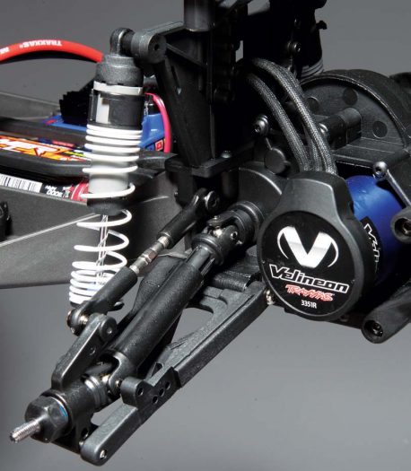 On to the power system. A waterproof Velineon VXL-3S speed control is securely mounted to the right-hand side of the chassis. It has three easy-to-set running modes; Sport Mode with full forward, brake and reverse, Race Mode with just full forward and brake, and Training Mode with 50-percent forward, brake and 50-percent reverse. It can be used with both sensors and sensorless motors and has an integrated on/off/ programming switch that won’t accidentally get hit when racing or bashing. The 2-pole Velineon 3500 motor is plenty quick and can help get the Slash up to 35mph with the stock battery and gearing. Should you want to take things up a level or two, simply changing the gear ratio and upgrading the battery pack to a 3S, 11.1V pack will let you rip up and down the street at 60mph!