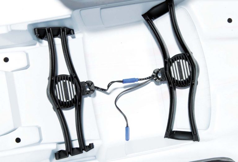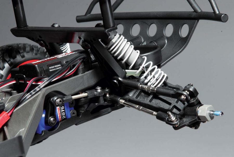 Super strong composite black suspension an all four corners of the Slash offer multiple shock mounting positions to aid in tuning. The coil- over oil filled shocks stretch upward toward the black composite towers. They have gray composite bodies and use white progressive rate springs that help the Slash handle tough off-road terrain with ease. All of the thick turnbuckles feature adjusting knuckles to tune camber and toe and have captured style ball ends that won’t pop off under extreme conditions.