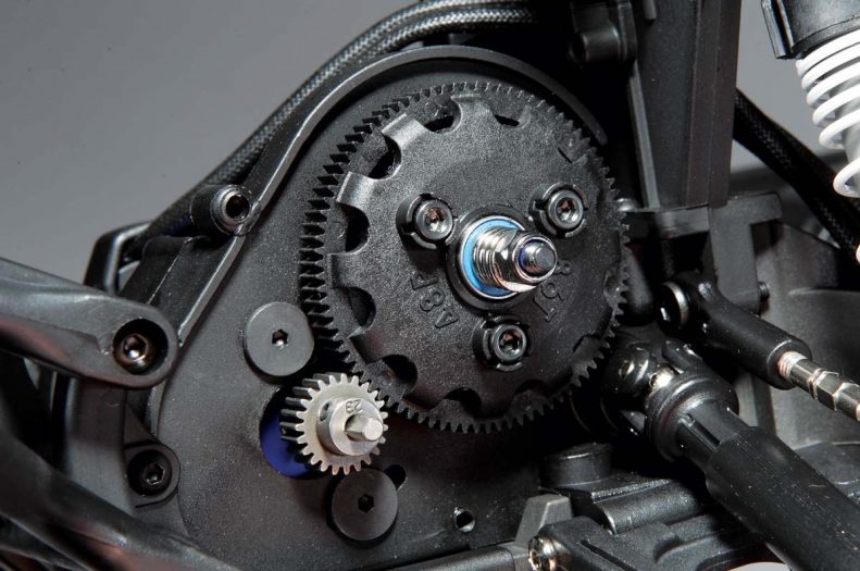 I used to say that the Magnum 727 3-gear transmission that Traxxas uses on the Slash was nearly indestructible. Well, after having eight years of experience with the Slash I’d like to amend that statement and say that it is indestructible. Featuring all 48-pitch gears, it has a composite steel planetary gear differential, and Revo spec Torque Control slipper clutch with 86-tooth spur gear. Heavy-duty, slide-style driveshafts with universal joints at either end transfer power from the gearbox to the wheels. Speaking of the wheels, they mount up to the axles on 12mm hex adapters while serrated lock-nuts keep them in place.