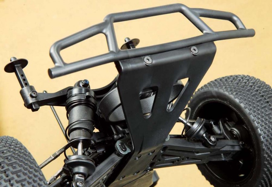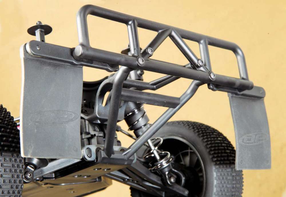 The chassis is a great platform and remains unchanged from the ProLite 4×4. It is quite wide and lacks the angled sides for extra ground clearance, but is extremely organized. The servo, water- resistant receiver box, ESC and motor are all mounted on the left side of the chassis, squeezed in tight to the centerline of the chassis. The battery box takes up the entire right side, with plenty of room to move the battery fore or aft for weight balance. The chassis is also modular, allowing you to access the front or rear clips with the removal of just a few screws. Running down the spine is a plastic top deck that helps keep debris out of the shaft drive system as well as removing all front-to-back flex. Large side bumpers help absorb impacts and keep the body from folding under should you mix it up with a fellow track mate.
