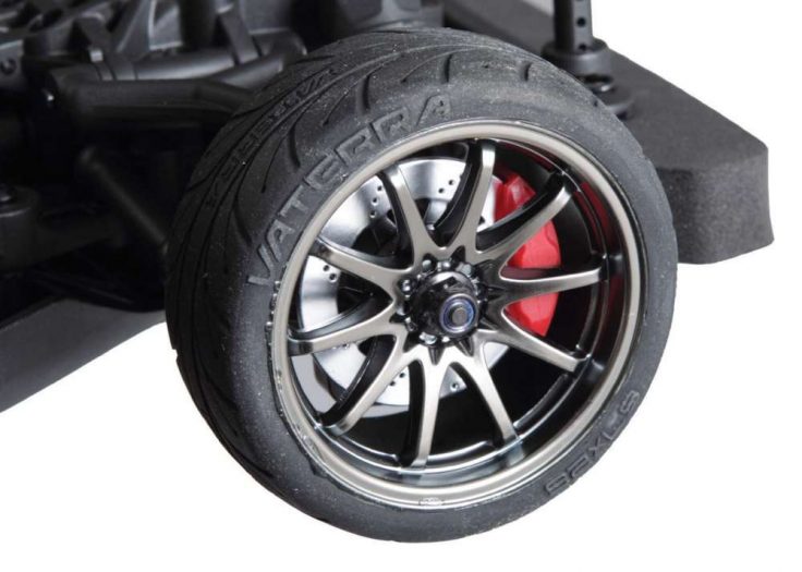 Like most entry-level on-road cars the V100-S chassis has mostly fixed suspension points with few adjustments. While this may seem frustrating to someone long in the hobby, we realize these cars end up in the hands of a lot of enthusiasts as their first hobby grade RC car and sometimes not giving them a lot of tuning options is a good thing. We’ve seen way too many people whip out the Allen wrenches or turnbuckle wrench and make their car completely undriveable. That said, the V100-S chassis does allow for small caster changes via shims instead of the caster being built into the uprights. Rear anti-squat is adjusted in a similar manner. The wheelbase is fixed, allowing most any 190mm or 200mm touring car body to be fitted, though off-set wheels may be required for some bodies. The one disappointment in the suspension department, even for an entry-level car, is that Vaterra fit friction shocks to this chassis. They seem to do the job on most surfaces, but the hardcore RC’er in me still feels the chassis should be fitted with proper fluid-filled coilover shocks.