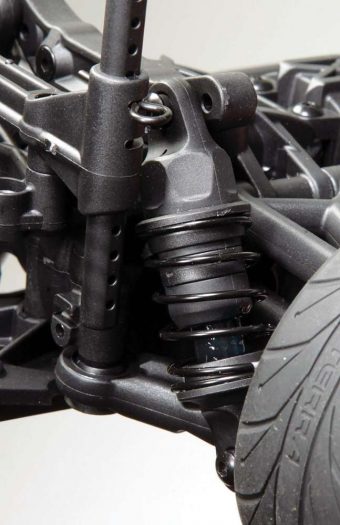 The V100-S chassis is the mainstay of all of Vaterra’s licensed on-road cars. The chassis is an injection-molded composite that is very stiff. On the bottom you’ll find a smooth deck with countersunk screws and a series of X-bracing down the middle tunnel. Topside, the chassis features composite shock towers/bulkheads and a bolt-in brace running the length of the chassis just above the center driveshaft. This bolt-in brace allows easy access for drivetrain maintenance, yet prevents fore- to-aft chassis flexing. It is a simple, yet effective design you can easily see in action by attempting to wiggle the brace when pressure is applied to the chassis.