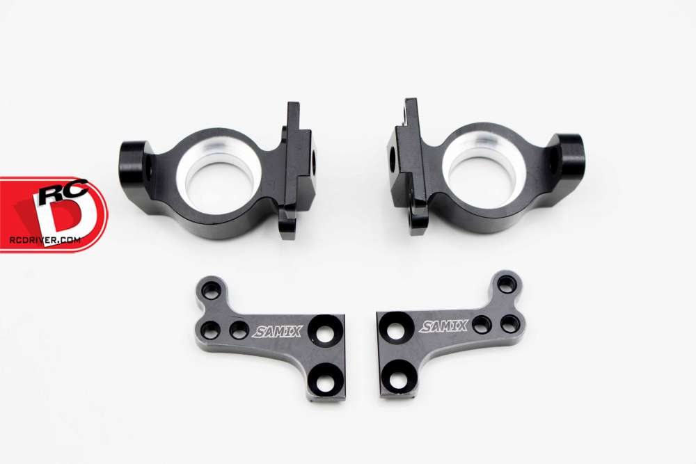 The 8-Degree High Clearance Steering Knuckles feature a 2-piece design; the knuckle that holds the bearings and the steering plate that attaches to the knuckle by way of 2 screws. The steering plate has three tuning holes for the steering turnbuckle, has the SAMIX name etched in silver and there are jewel cut edges to add the silver eye catching look. These black anodized knuckles work in conjunction with the SAMIX RC 8-Degree Hub Carriers. Like the Cross Brace the parts were easy to install dun to being precision machined and look great.
