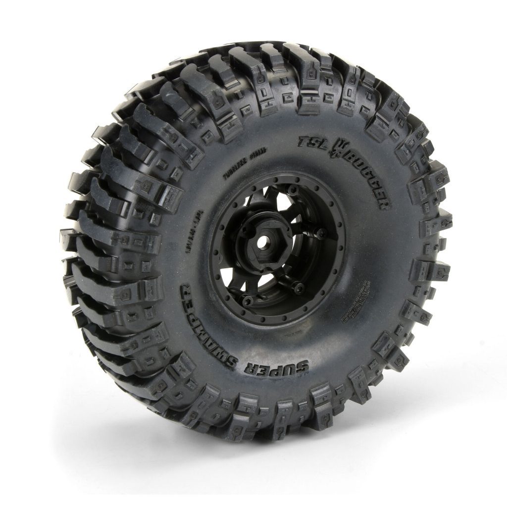 The Interco Bogger 1.9” tires come pre-mounted on Pro-Line Impulse black plastic 1.9” wheels. They have a three piece wheel design that bolts together in the back and locks on to the Interco Bogger tires via 6 screws. This complete tire and wheel package look so good together and will nicely update the Axial Base Camp crawler.