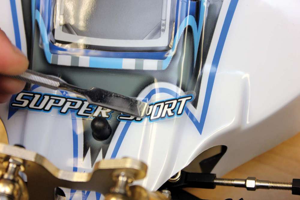 When a sticker needs to go over curves, getting it to lay flat can be nearly impossible. A trick to combat this issue is a hairdryer. Warm the sticker with the hairdryer to make it more pliable so you can work it over the curve and get it seated smoothly. Be careful not to overheat and damage the sticker and/ or body. You can also make a couple of relief cuts into the sticker with a hobby knife to allow the sticker to lay flat.