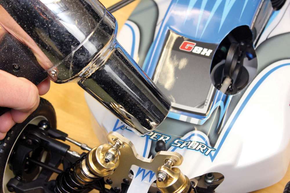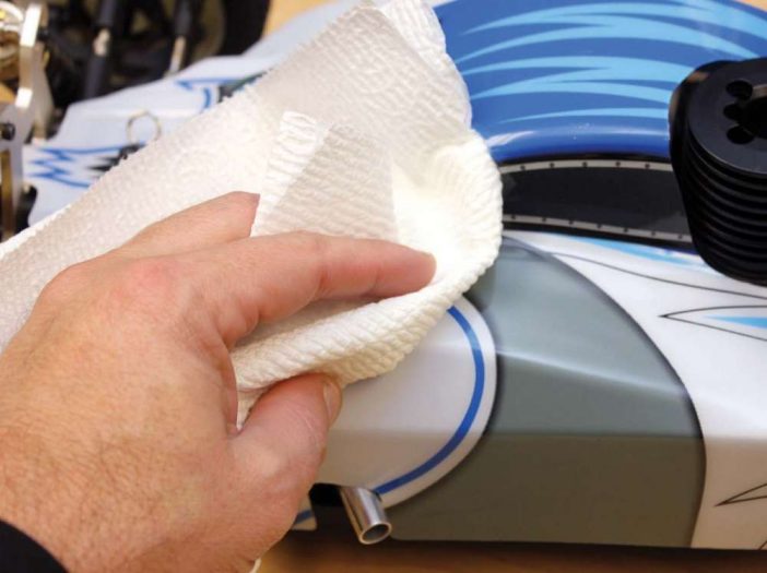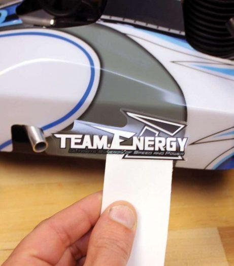 If you need to remove a sticker, whether it is on an old RTR body that you are freshening up or you changed your mind about a sticker that you just applied, this tip will come in very handy to get all of the sticker residue removed from the body. Use a paper towel doused with motor spray. This combo will quickly and completely remove all of the sticky mess from the surface of the body.