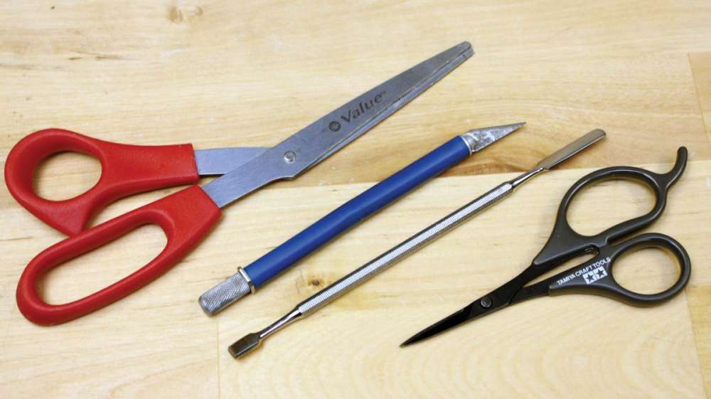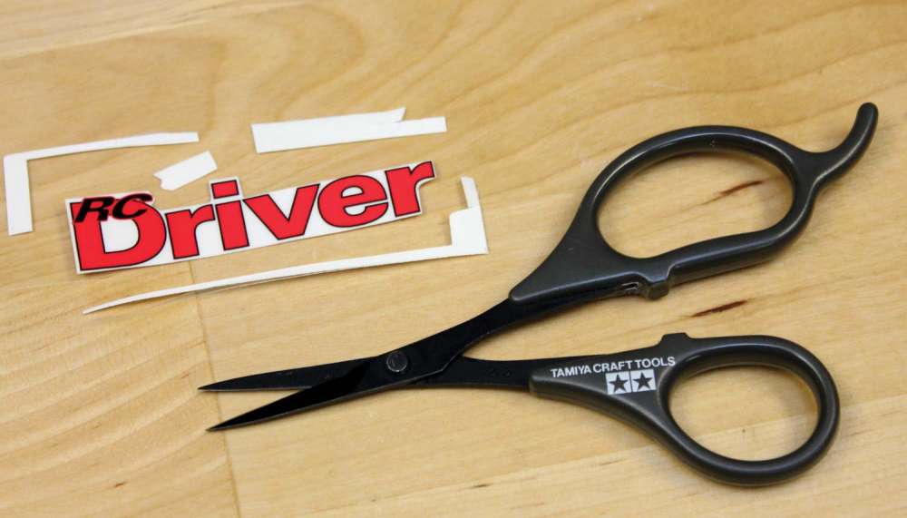 I use three different tools to cut out stickers depending on the sticker: standard scissors, decal scissors and a hobby knife. Most of the time I use a quality pair of regular scissors. When the stickers are very intricate or tiny, I use Tamiya Decal Scissors (item no. 74031, $23). These scissors are just awesome with blades that are short, thin and have a sharp point. Vinyl stickers will make the blades dull but they are too handy not to use for tiny stickers. The hobby knife is handy for weeding out stickers and for making cuts that are too delicate for scissors. What you end up using will come down to what you feel most comfortable with.