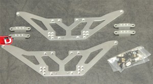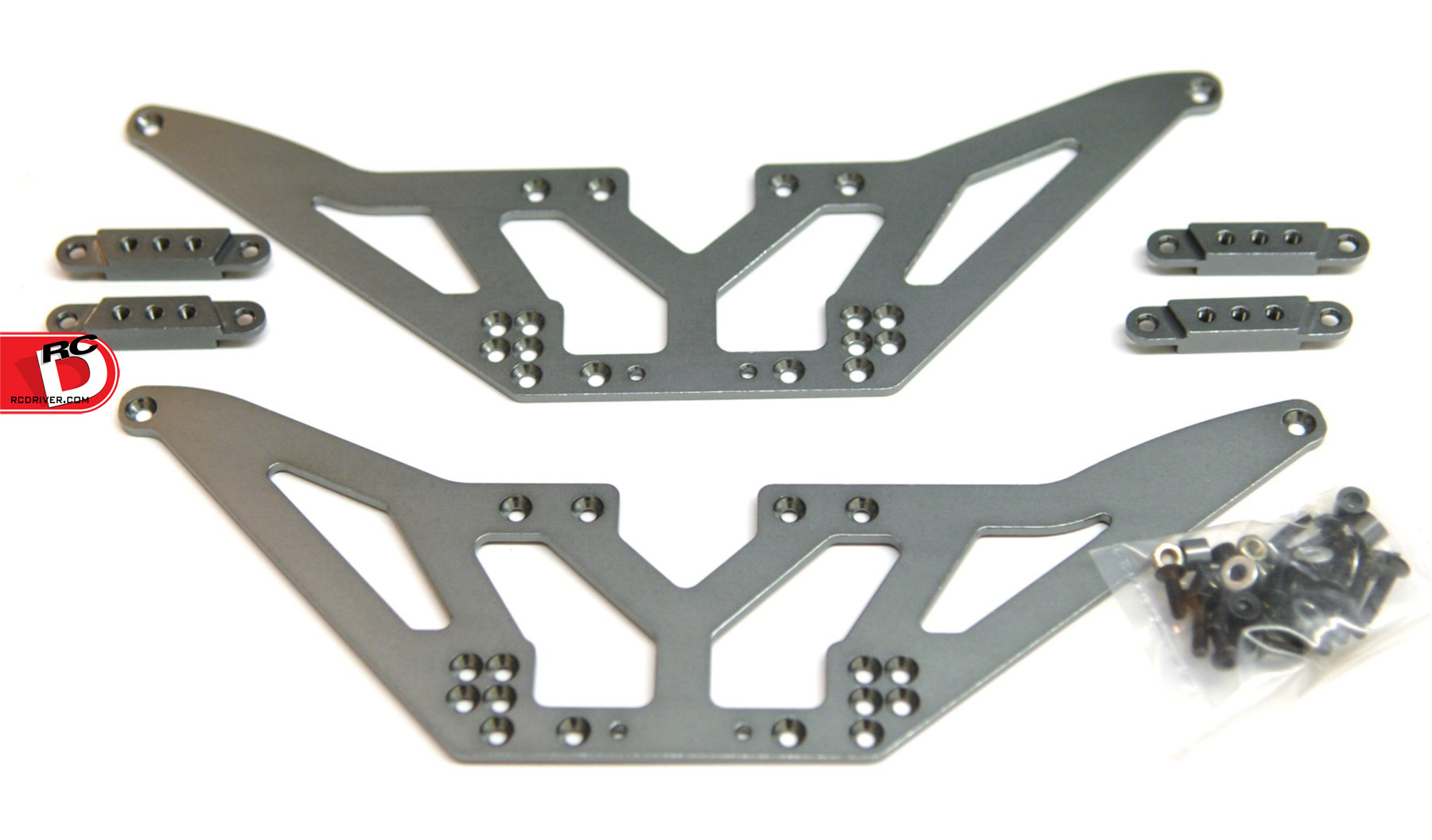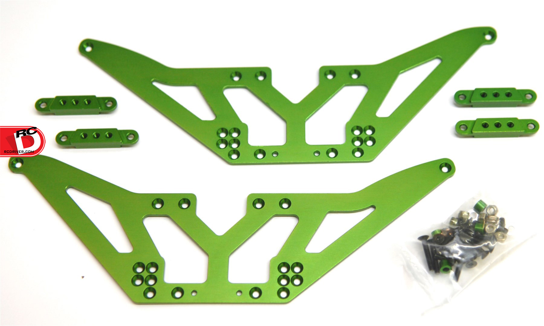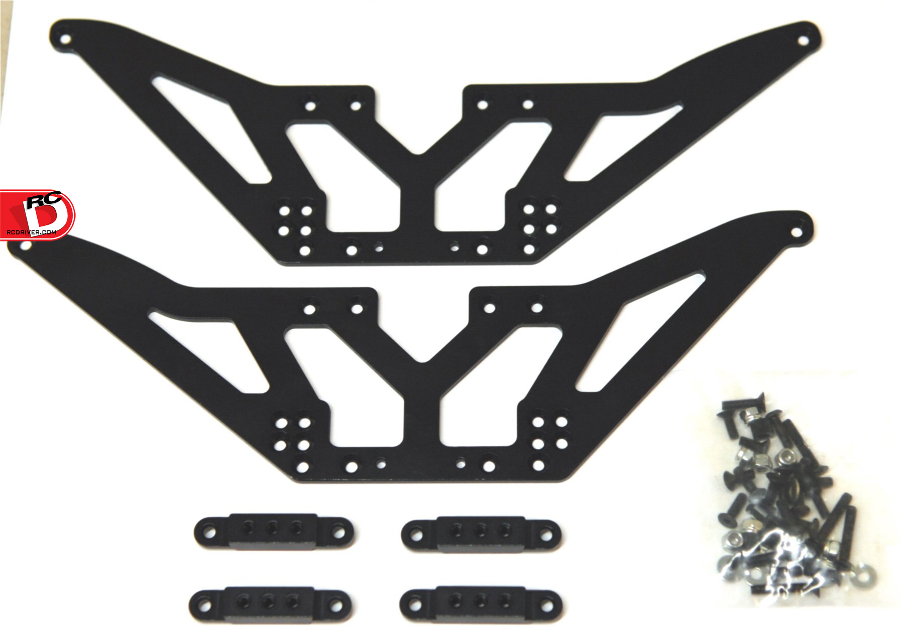 Mud Trucks/Mega Trucks seem to be all the rage lately with SCX10 owners lifting up the suspension and chassis to put on 2.2 size tires. The trend started with ingenious builders using old AX10 scorpion components and bolting it to the SCX10 chassis rails, but as components for this legendary vehicle start to dry up, this modification became more and more difficult. Some are able to do a simple lift by adding shock tower plates, but this leaves the center transmission and motor riding high and the suspension links really out of place. With our CNC Machined Aluminum Lift kit for the SCX10, it actually starts with the drop of the center transmission/motor and skid plate using heavy duty 2.5mm thick CNC Machined aluminum side plates. These high quality aluminum chassis plates spans from front shock tower to rear shock tower following the contour of the chassis rails with light weight cut outs that give is a great look, but still maintains strength and durability. All the holes on the chassis plates are countersunk for a smooth clean factory look and leaving nothing out to snagging.