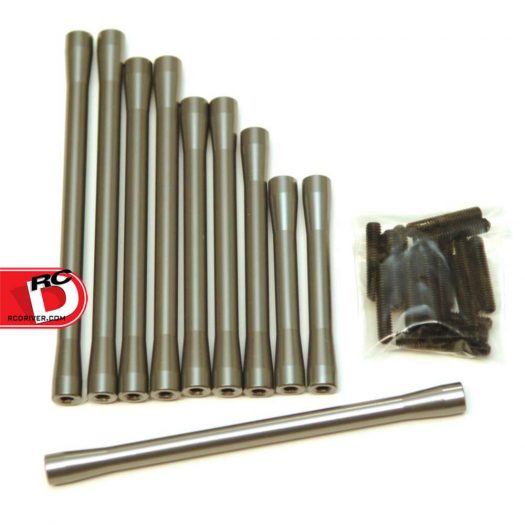 Convert your entire SCX10 II RTR’s suspension and steering links to the same spec as the SCX10 II Kit version with this complete 10pcs high quality CNC Machined Aluminum Suspension and steering links kit.  Each piece features 7.5mm diameter ends that gradually taper to a 6mm center for durability and good ground clearance.  Using the thicker and more durable included M4x20mm set-screws to connect to the new Axial turnbuckle ends that’s already on your SCX10 II RTR.  Simply unscrew the turnbuckle ends from your SCX10 II RTR off the stock threaded rod and reuse them to install straight onto these great aluminum links using the included M4 set-screws.  This complete set will take care of the entire truck’s suspension, steering, and Panhard Link.  Note: Please follow the SCX10 II kit instruction manual from Axial’s website to match up each link properly for its use.
