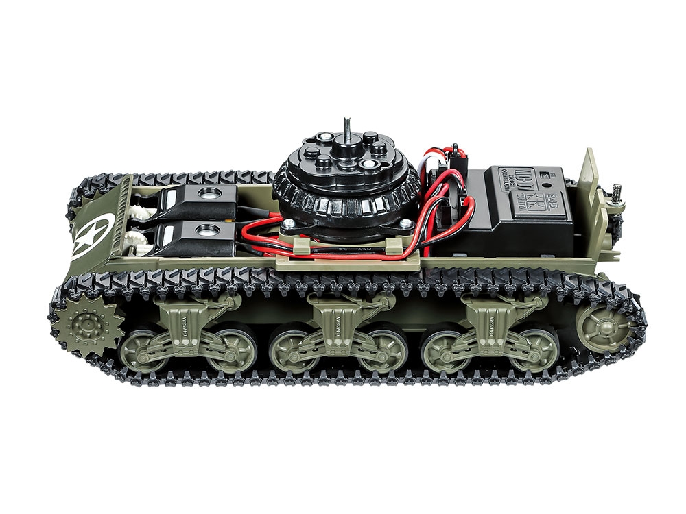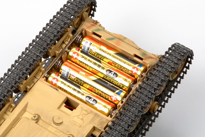 Tank is powered by 4 alkaline batteries, which can be accessed via a hatch on the underside of the hull.