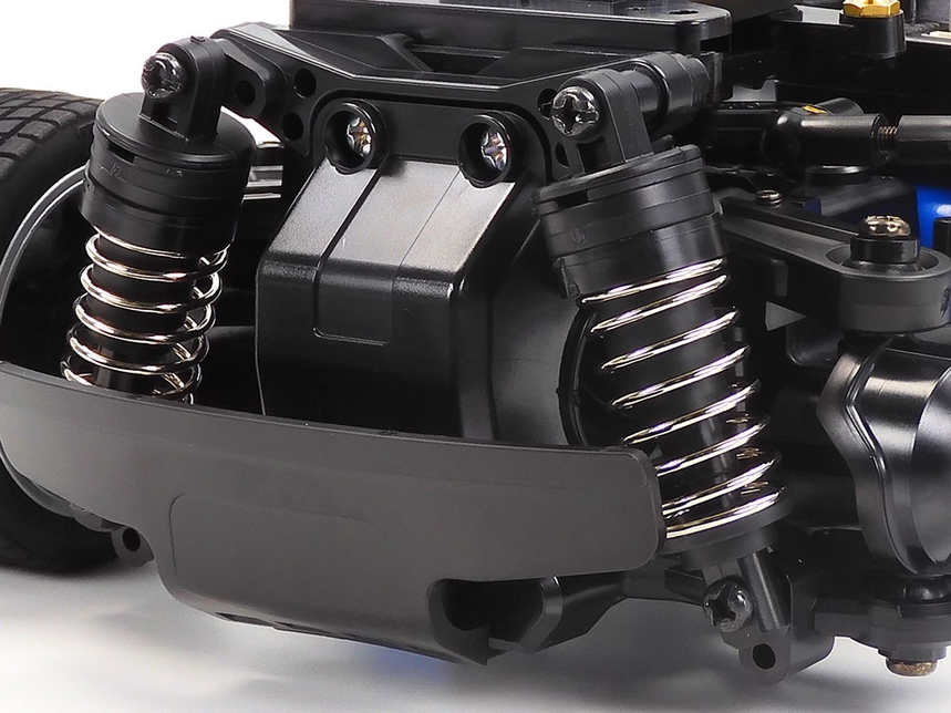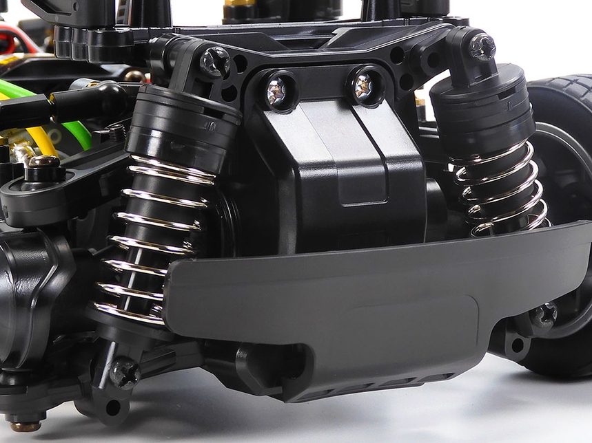 wheel drive system. This model employs a midship motor, rear-wheel drive setup. Without removing battery pack, motor, and RC equipment setups from the center frame, simply change attachment directions of final gears and steering linkage to switch between front- and rear-wheel drive; low or high motor position can be chosen for rear-wheel drive cars. The 4-wheel double wishbone suspension features symmetrical structure and friction dampers. Unitized sections such as motor mount, final gears and suspension facilitate ease of assembly and effective maintenance.