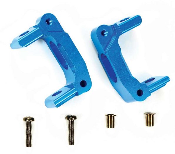These are front hub carriers for the left and right of the Tamiya Heavy Dump Truck. They are masterfully machined from aluminum and provide 8-degrees of caster angle. You will find that your truck will hold a straight course better than in its stock form and give you better cornering ability.