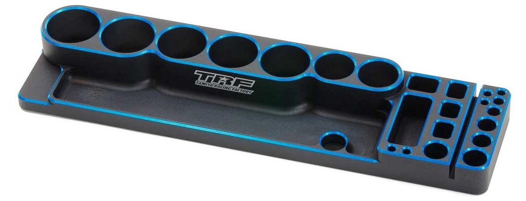 We like our workbench and pit area to be organized, especially when it comes to the tools that you are constantly reaching for. A great solution is this compact TRF Aluminum Tool Stand which was designed to hold seven of Tamiya’s most used TRF tools. It can hold TRF hex wrenches, box wrenches, Tamiya camber gauge, turnbuckle wrenches and long-nose pliers. There is also a small area to keep small screws and parts. A welcome feature is that the tray is magnetized to keep the tiny metal fasteners from getting lost. And instead of having the entire tray anodized in the typical Tamiya blue, Tamiya anodized it in black and finished it off with blue anodized chamfering followed by the TRF log laser printed on the front face of the tool stand.