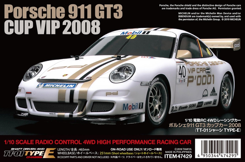 This Tamiya R/C kit faithfully recreates the Porsche 911 GT3 CUP VIP customer race car. The Porsche 911 GT3 Cup VIP features a shaft-driven 4WD TT-01 Type-E chassis that has its motor mounted longitudinally for optimum balance. Mounted on the bathtub frame are fiberglass reinforced nylon upper deck and gear covers that improve rigidity.