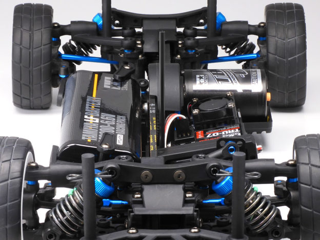 Angled battery and R/C equipment give optimum weight distribution, and a compact, grippy chassis, even on low-grip surfaces.